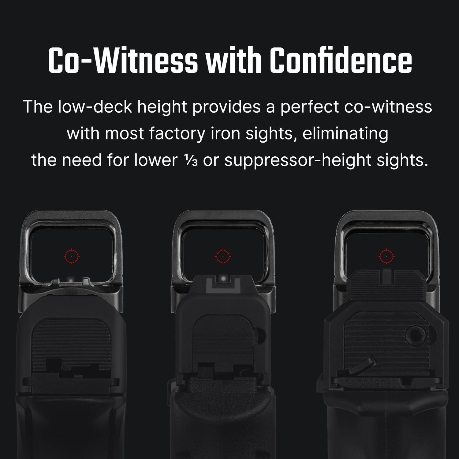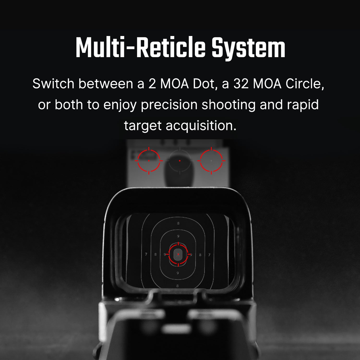 2 MOA Punto & 32 MOA Cerchio: Scegli tra reticoli punto-e-cerchio, solo punto, o solo cerchio per qualsiasi scenario di tiro con una soluzione di mira nitida e luminosa.