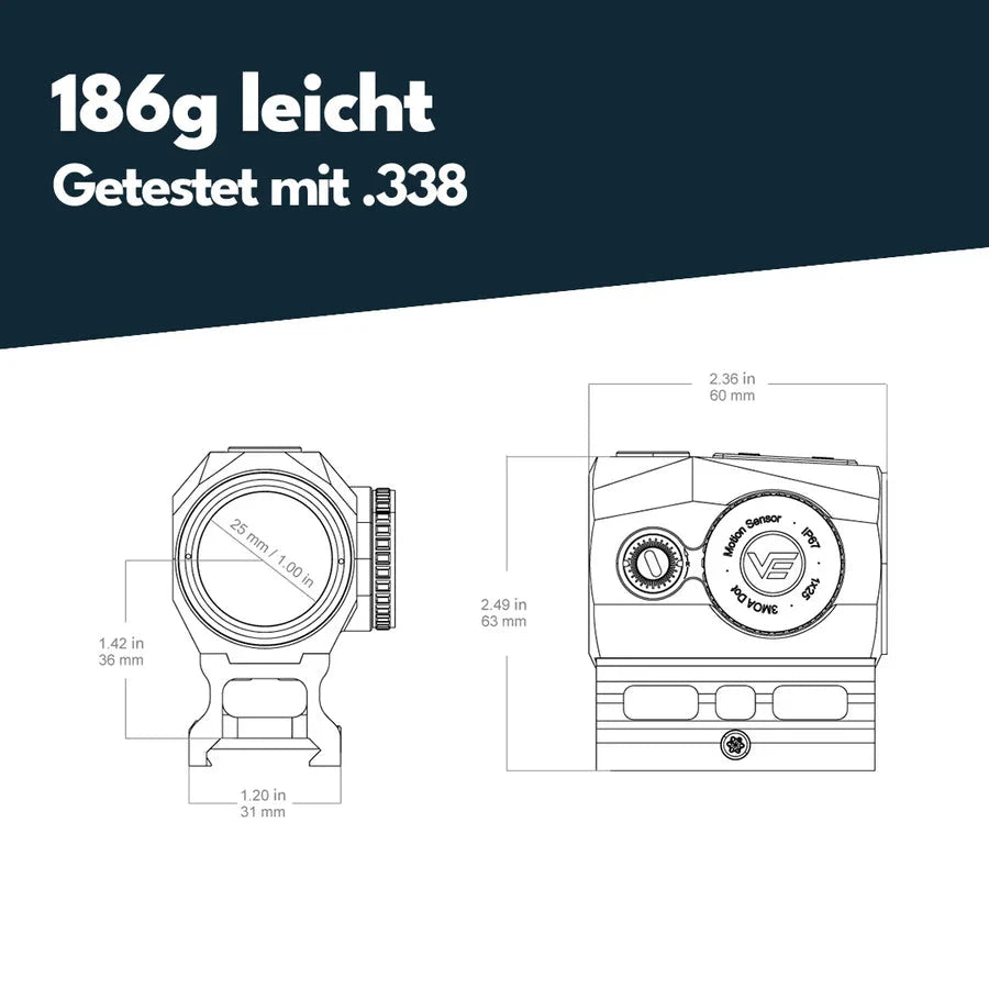 Questa versione si distingue per il design compatto, il peso ridotto e un preciso punto da 3 MOA. Offre inoltre co-witness assoluto (36 mm) e include un sensore di movimento per risparmiare la batteria (spegnimento automatico dopo 2 minuti senza movimento e riaccensione immediata non appena viene spostato).